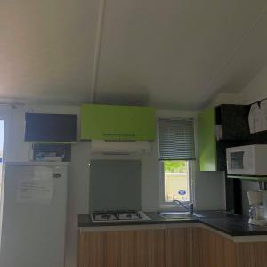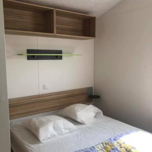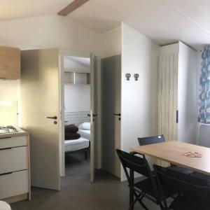 Mobil-Home de 4/6 places, comprenant 1 chambre avec un grand lit, deux chambres avec 2 lits d'une personne (1 couverture par lit), un salon, une cuisine (cuisinière à gaz, micro-onde) une salle de bains (douche et wc séparés), chauffage, terrasse et meubles de jardin. Draps et linge non fournis